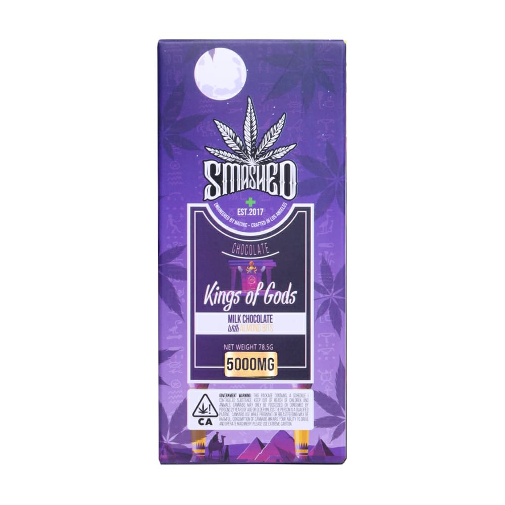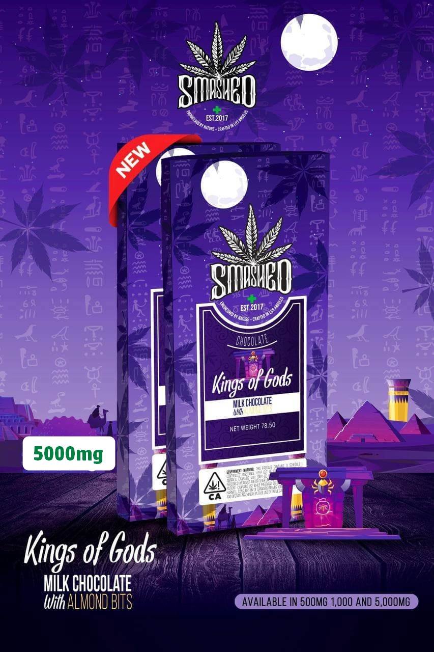 Smashed Chocolate bars 5000MG, Introducing the Kings of Gods Milk Chocolate Bar with Almond Bits, a decadent treat weighing in at 2.75 ounces (78.5 grams). Each luxurious piece is thoughtfully infused with a full spectrum of THC cannabis oil, providing a rich and smooth experience that elevates your enjoyment. Indulge in the delightful combination of creamy milk chocolate and crunchy almond bits, designed to satisfy your sweet cravings while delivering a royal dose of relaxation. Elevate your snacking experience and feel like royalty with every bite of this remarkable edible